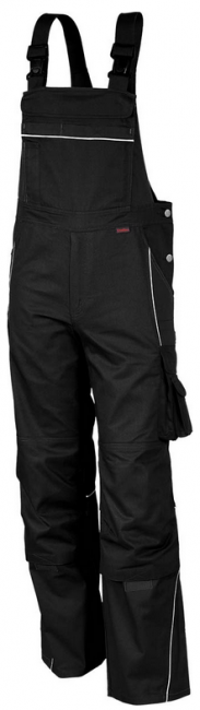2 front pockets used. 2 back pockets, closed with Velcro. Right double, collapsible ruler pocket with patch pocket tool. Links 1 thigh pocket with patch mobile phone pocket + tool bag, closed with flap and Velcro-closure. Links additionally incorporated welt pocket. Hammer loop. Fly with metal zipper. Articulated knees and knee pocket with velcro. Elastic stretch insert under knee pocket. Reflexpaspelan the front contrasting panels and rear knee seams, on the bib pocket and back yoke. Side 2-way adjustable waistband with jeans buttons, Elasticträger with security clasp. Back waistband inside with elastic, adjustable with knob. High Pulled Cross back.