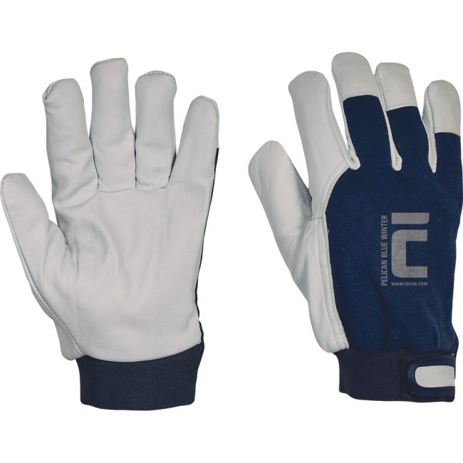 Gloves sewn from fine sheepskin on the palm and blue cotton fabric on the back with a velcro cuff.