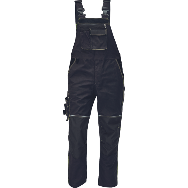 2 side pockets, 1 multifunctional pocket on the leg side, 1 multifunctional flap pocket on the bib, D-ring for ID card attaching, 2 flap pockets on the back. Reinforced knee parts with input for knee pads, extendable length of legs of 5 cm. Reinforced back part of bottom leg. Decorative stitching and contrast details in hi-vis colour.