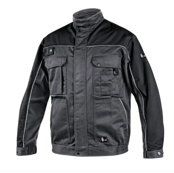 Men ́s working jacket, sleeves with adjustable cuff, small pencil pocket on the left sleeve, covered zipper fastening with snaps, multifunctional chest pockets, side pockets, waist with side elastic bands, loops for various using, reflective accessories.