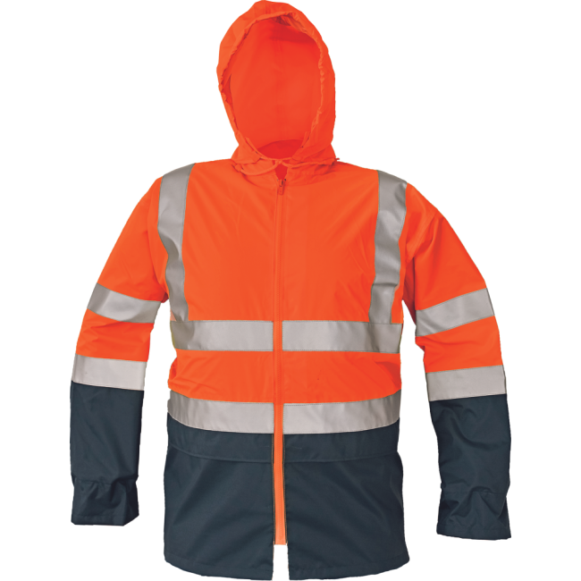 Hi-Vis jacket without lining taped seams water resistance class 3 according to norm EN 343, permeability class 1 according to norm EN 343 reflective stripes 3M hood in collar bottom hem with drawstring.