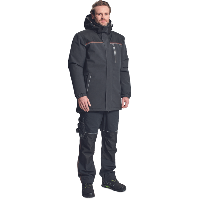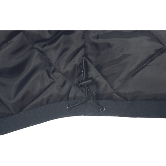 Extended back part, reinforced shoulders. Chest pocket with zipper in contrast hi-vis colour, 2 side pockets, 2 closable inside pockets. Input for embroidery or print, adjustable bottom by draw string, saddle and pockets lined with reflective piping, decorative stitching in contrast hi-vis colour.