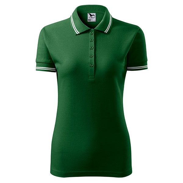 Women's polo shirt with contrasting color lines on the collar and sleeves.