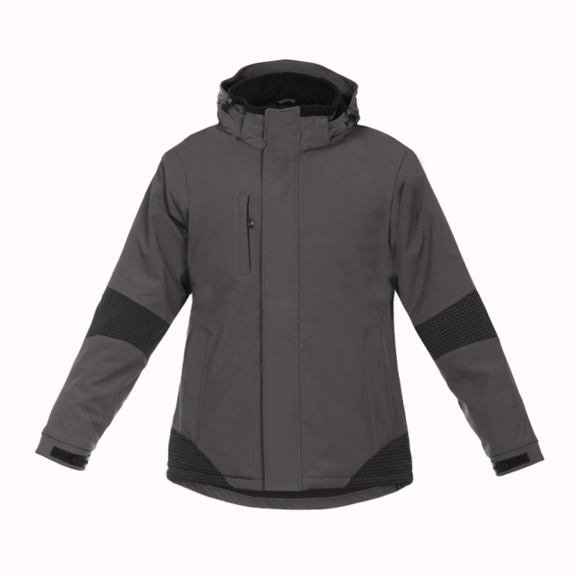Приталенная, теплая, водо- и ветрозащитная, дышащая женская рабочая куртка из ткани софтшелл со светоотражающими деталями из ткани с принтом.
