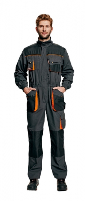 Усилительные накладки из полиэстера 600D в местах наиболее подверженных износу. Резинка в поясе. Усиление при помощи карманов-наколенников для коленных амортизаторов. Петля для ручного инструмента.