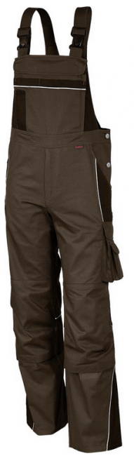 2 front pockets used. 2 back pockets, closed with Velcro. Right double, collapsible ruler pocket with patch pocket tool. Links 1 thigh pocket with patch mobile phone pocket + tool bag, closed with flap and Velcro-closure. Links additionally incorporated welt pocket. Hammer loop. Fly with metal zipper. Articulated knees and knee pocket with velcro. Elastic stretch insert under knee pocket. Reflexpaspelan the front contrasting panels and rear knee seams, on the bib pocket and back yoke. Side 2-way adjustable waistband with jeans buttons, Elasticträger with security clasp. Back waistband inside with elastic, adjustable with knob. High Pulled Cross back.