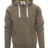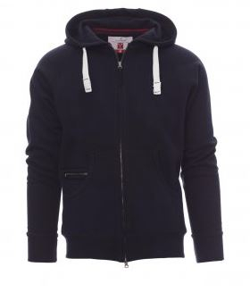 Men’s hoodie with full, plastic-covered SBS zip with double metal pull, hood with double stitched seams and white drawstring with contrasting stitching and metal rings, raglan sleeves, kangaroo pockets, small zip pocket, stretch rib cuffs and hem, reinforced seams.