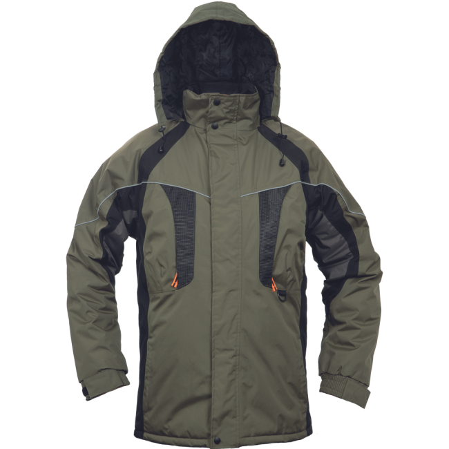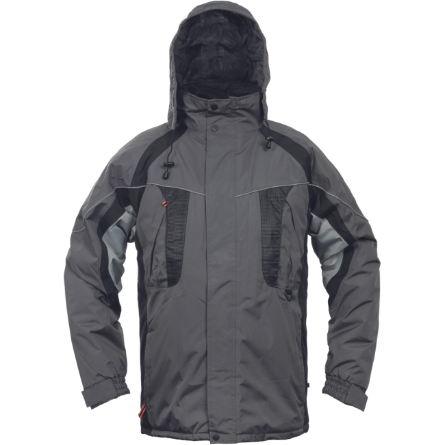 Waterproof thermoinsulated jacket with hood in collar. Suitable for printing.