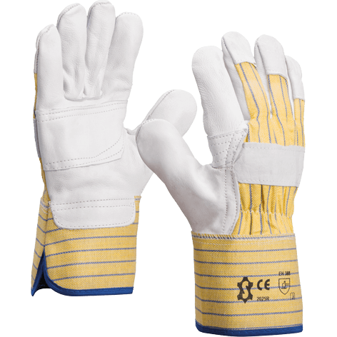 Darba cimdi no ādas ar pastiprinātu plaukstu un gumijotu aproci. Nodrošina aizsardzību pret smagu darbu sausā vidē.