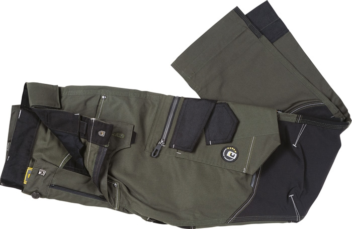 Papildu ilgmūžību nodrošina CORDURA® pastiprinājumi ceļgalu zonā, kas ļauj izmantot bikses arī smagos darba apstākļos. Trīskāršas šuves garantē izturību un samazina auduma nodilumu.