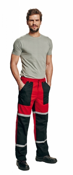 Эластичный пояс, застежка на молнии и металлическую пуговицу. Задний карман справа, на правой штанине карман для складного метра. Сигнальные элементы – полосы шириной 2,5 см.