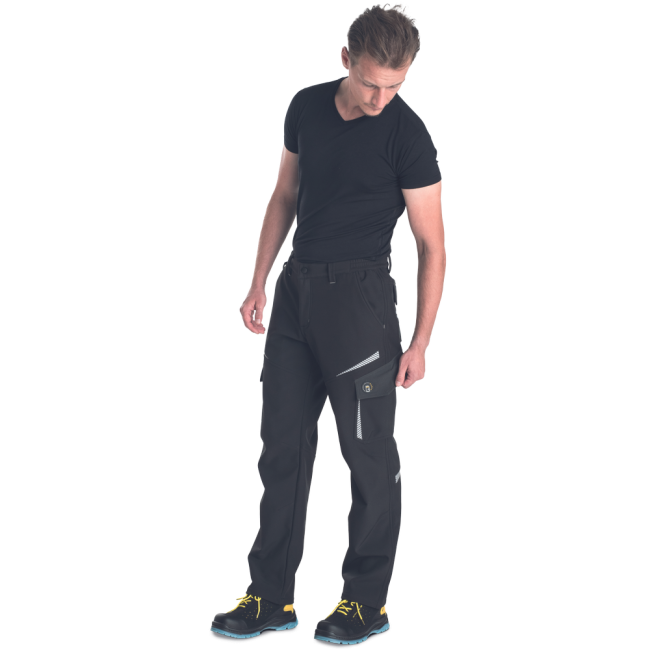 Зимние софтшелл брюки EMERTON STR изготовлены из 96% полиэстера и 4% спандекса (310 г/м²) с покрытием TPU, обеспечивающим защиту от ветра и влаги. Внутренняя подкладка выполнена из флиса (100% полиэстер), что гарантирует тепло и комфорт даже в холодных условиях. Брюки оснащены эластичным поясом, двумя боковыми карманами, двумя задними карманами с клапанами на липучке, а также двумя карманами на бёдрах с клапанами на липучке. Для повышения безопасности предусмотрены светоотражающие элементы.