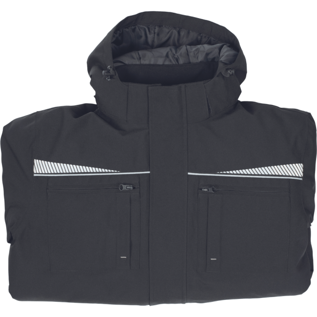 Зимняя куртка EMERTON STR выполнена из 100% полиэстера (210 г/м²) с покрытием TPU, обеспечивающим водонепроницаемость и износостойкость. Внутренняя подкладка и утеплитель изготовлены из 100% полиэстера, что гарантирует тепло и комфорт в холодную погоду. Куртка оснащена съёмным утеплённым капюшоном, застёжкой-молнией с ветрозащитной планкой на липучке, двумя боковыми карманами на молнии, двумя нагрудными и двумя внутренними карманами. Эластичные манжеты на рукавах обеспечивают удобную посадку. Светоотражающие элементы и отделка повышают безопасность и заметность.